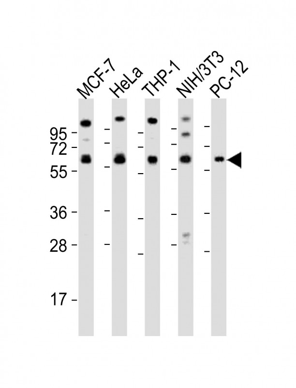 All lanes : Anti-PKM2(K136) antibody at 1:2000 dilution Lane 1: MCF-7 whole cell lysates Lane 2: Hela whole cell lysates Lane 3: THP-1 whole cell lysates Lane 4: NIH/3T3 whole cell lysates Lane 5: PC-12 whole cell lysates Lysates/proteins at 20 μg per lane. Secondary Goat Anti-Rabbit IgG, (H+L), Peroxidase conjugated at 1/10000 dilution Predicted band size : 58 kDa Blocking/Dilution buffer: 5% NFDM/TBST. |