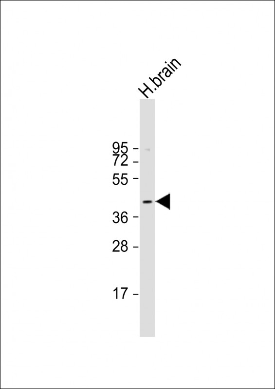 Anti-PRKACB Antibody (K29) at 1:1000 dilution + human brain lysate Lysates/proteins at 20 μg per lane. Secondary Goat Anti-Rabbit IgG, (H+L), Peroxidase conjugated at 1/10000 dilution. Predicted band size : 41 kDa Blocking/Dilution buffer: 5% NFDM/TBST.