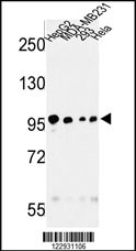 Western blot analysis of MASTL Antibody (Cat. APR17324G) in HepG2, MDA-MB231, 293, Hela cell line lysates (35ug/lane). MASTL (arrow) was detected using the purified Pab.