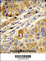Formalin-fixed and paraffin-embedded human hepatocarcinoma reacted with MASTL Antibody, which was peroxidase-conjugated to the secondary antibody, followed by DAB staining. This data demonstrates the use of this antibody for immunohistochemistry; clinical relevance has not been evaluated.