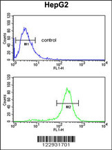 MASTL Antibody (Cat. APR17324G) flow cytometric analysis of HepG2 cells (bottom histogram) compared to a negative control cell (top histogram).FITC-conjugated goat-anti-rabbit secondary antibodies were used for the analysis. |