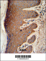 PKM2 Antibody (C-term L398) (Cat. AMR09312G) IHC analysis in formalin fixed and paraffin embedded skin tissue followed by peroxidase conjugation of the secondary antibody and DAB staining. This data demonstrates the use of the PKM2 Antibody (C-term L398) for immunohistochemistry. Clinical relevance has not been evaluated. |