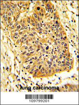 Formalin-fixed and paraffin-embedded human lung carcinoma reacted with RIOK1 Antibody (N-term), which was peroxidase-conjugated to the secondary antibody, followed by DAB staining. This data demonstrates the use of this antibody for immunohistochemistry; clinical relevance has not been evaluated.
