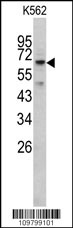 Western blot analysis of RIOK1 antibody (N-term) (Cat. AMM07632G) in K562 cell line lysates (35ug/lane). RIOK1 (arrow) was detected using the purified Pab.