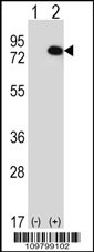 Western blot analysis of RIOK1 (arrow) using rabbit polyclonal RIOK1 Antibody (N-term) (Cat. AMM07632G). 293 cell lysates (2 ug/lane) either nontransfected (Lane 1) or transiently transfected (Lane 2) with the RIOK1 gene. |
