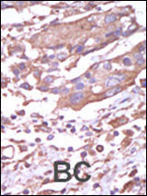 Formalin-fixed and paraffin-embedded human cancer tissue reacted with the primary antibody, which was peroxidase-conjugated to the secondary antibody, followed by AEC staining. This data demonstrates the use of this antibody for immunohistochemistry; clinical relevance has not been evaluated. BC = breast carcinoma; HC = hepatocarcinoma.
