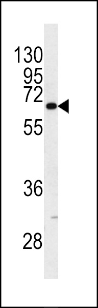 Western blot analysis of KRT9 antibody (Center K444) (Cat. APR17132G) in NCI-H460 cell line lysates (35ug/lane). KRT9 (arrow) was detected using the purified Pab. |