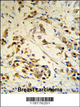 RBM3 Antibody (Center) (RB18776) IHC analysis in formalin fixed and paraffin embedded human breast carcinoma followed by peroxidase conjugation of the secondary antibody and DAB staining. This data demonstrates the use of the RBM3 Antibody (Center) for immunohistochemistry. Clinical relevance has not been evaluated. |