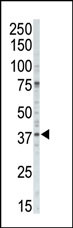 Western blot analysis of anti-CK1a Pab (Cat. APR14316G) in A375 cell lysate. CK1a (arrow) was detected using purified Pab. Secondary HRP-anti-rabbit was used for signal visualization with chemiluminescence. |