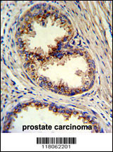 Formalin-fixed and paraffin-embedded human prostate carcinoma reacted with GOLPH3 Antibody (N-term), which was peroxidase-conjugated to the secondary antibody, followed by DAB staining. This data demonstrates the use of this antibody for immunohistochemistry; clinical relevance has not been evaluated.