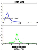 Flow cytometric analysis of hela cells using GOLPH3 Antibody (N-term)(bottom histogram) compared to a negative control cell (top histogram). FITC-conjugated goat-anti-rabbit secondary antibodies were used for the analysis. |
