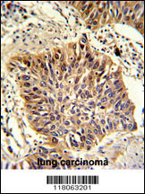 Formalin-fixed and paraffin-embedded human lung carcinoma with GOLPH3 Antibody (C-term), which was peroxidase-conjugated to the secondary antibody, followed by DAB staining. This data demonstrates the use of this antibody for immunohistochemistry; clinical relevance has not been evaluated.