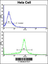 Flow cytometric analysis of hela cells using GOLPH3 Antibody (C-term)(bottom histogram) compared to a negative control cell (top histogram). FITC-conjugated goat-anti-rabbit secondary antibodies were used for the analysis. |