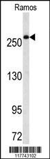 Western blot analysis of FASN Antibody (Center) (Cat. AMM04512G) in Ramos cell line lysates (35ug/lane).FASN (arrow) was detected using the purified Pab. |