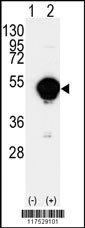 Western blot analysis of CYP20A1(arrow) using rabbit polyclonal CYP20A1 Antibody (C-term)(Cat. APG02859G). 293 cell lysates (2 ug/lane) either nontransfected (Lane 1) or transiently transfected with the CYP20A1 gene (Lane 2) (Origene Technologies).