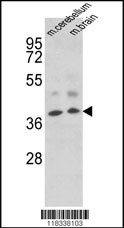 Western blot analysis of EN2 Antibody (C-term) (Cat. APR11821G) in mouse cerebellum, brain tissue lysates (35ug/lane). EN2 (arrow) was detected using the purified Pab.