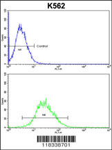 EN2 Antibody (C-term) (Cat. APR11821G) flow cytometric analysis of k562 cells (bottom histogram) compared to a negative control cell (top histogram).FITC-conjugated goat-anti-rabbit secondary antibodies were used for the analysis. |