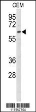 Western blot analysis of EHD3 Antibody (Center) (Cat. AMM07020G) in CEM cell line lysates (35ug/lane). EHD3 (arrow) was detected using the purified Pab.