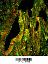 Immunofluorescence analysis of CAPZA1 Antibody (N-term) with paraffin-embedded human prostate carcinoma tissue . 0.05 mg/ml primary antibody was followed by FITC-conjugated goat anti-rabbit lgG (whole molecule). FITC emits green fluorescence.Red counterstaining is PI. |