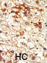 Formalin-fixed and paraffin-embedded human cancer tissue reacted with the primary antibody, which was peroxidase-conjugated to the secondary antibody, followed by DAB staining. This data demonstrates the use of this antibody for immunohistochemistry; clinical relevance has not been evaluated. BC = breast carcinoma; HC = hepatocarcinoma. |