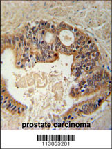 DYRK1A Antiboty (N-term) (Cat. APR11812G) immunohistochemistry analysis in formalin fixed and paraffin embedded human prostate carcinoma followed by peroxidase conjugation of the secondary antibody and DAB staining. This data demonstrates the use of the DYRK1A Antiboty (N-term) for immunohistochemistry. Clinical relevance has not been evaluated. |