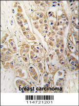 Formalin-fixed and paraffin-embedded human breast carcinoma tissue reacted with CLIC4 antibody (Cat. APG02654G), which was peroxidase-conjugated to the secondary antibody, followed by DAB staining. This data demonstrates the use of this antibody for immunohistochemistry; clinical relevance has not been evaluated. |