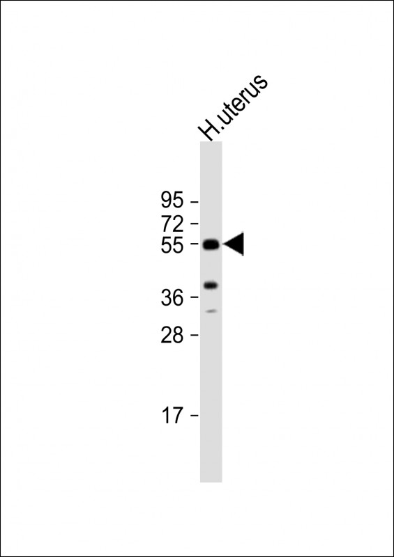 Anti-CYP19A1 Antibody (C-term) at 1:1000 dilution + human uterus lysate Lysates/proteins at 20 μg per lane. Secondary Goat Anti-Rabbit IgG, (H+L), Peroxidase conjugated at 1/10000 dilution. Predicted band size : 58 kDa Blocking/Dilution buffer: 5% NFDM/TBST.