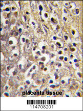 Formalin-fixed and paraffin-embedded human placenta tissue reacted with CYP19A1 antibody (C-term) (Cat. APG01994G), which was peroxidase-conjugated to the secondary antibody, followed by DAB staining. This data demonstrates the use of this antibody for immunohistochemistry; clinical relevance has not been evaluated. |