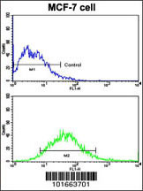 Flow cytometric analysis of MCF-7 cells using EphB6 Antibody (N-term S45) (bottom histogram) compared to a negative control cell (top histogram). FITC-conjugated goat-anti-rabbit secondary antibodies were used for the analysis. |