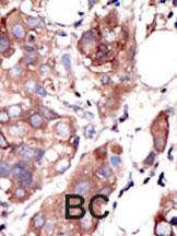 Formalin-fixed and paraffin-embedded human cancer tissue reacted with the primary antibody, which was peroxidase-conjugated to the secondary antibody, followed by AEC staining. This data demonstrates the use of this antibody for immunohistochemistry; clinical relevance has not been evaluated. BC = breast carcinoma; HC = hepatocarcinoma. |