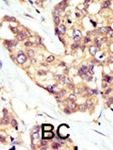 Formalin-fixed and paraffin-embedded human cancer tissue reacted with the primary antibody, which was peroxidase-conjugated to the secondary antibody, followed by AEC staining. This data demonstrates the use of this antibody for immunohistochemistry; clinical relevance has not been evaluated. BC = breast carcinoma; HC = hepatocarcinoma. |