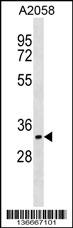 CDK5R1 Antibody (C-term) (Cat. AMM05734G) western blot analysis in A2058 cell line lysates (35ug/lane).This demonstrates the CDK5R1 antibody detected the CDK5R1 protein (arrow). |