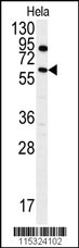 Western blot analysis of anti-ANTXR1 Antibody (Y382)(Cat. APR10982G) in Hela cell line lysates (35ug/lane). ANTXR1 (arrow) was detected using the purified Pab.