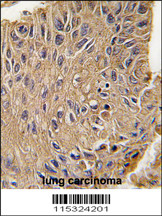 Formalin-fixed and paraffin-embedded human lung carcinoma tissue reacted with ANTXR1 Antibody (Y382) (Cat. APR10982G), which was peroxidase-conjugated to the secondary antibody, followed by DAB staining. This data demonstrates the use of this antibody for immunohistochemistry; clinical relevance has not been evaluated. |