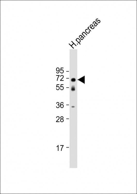 Anti-BACE1 Antibody (N-term) at 1:1000 dilution + human pancreas lysate Lysates/proteins at 20 μg per lane. Secondary Goat Anti-Rabbit IgG, (H+L), Peroxidase conjugated at 1/10000 dilution. Predicted band size : 56 kDa Blocking/Dilution buffer: 5% NFDM/TBST.