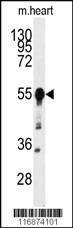 Western blot analysis of anti-BACE1 Antibody (N-term) (Cat. APG03026G) in mouse heart tissue lysates (35ug/lane). BACE1(arrow) was detected using the purified Pab.
