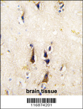 Formalin-fixed and paraffin-embedded human brain tissue reacted with BACE1 antibody (N-term), which was peroxidase-conjugated to the secondary antibody, followed by DAB staining. This data demonstrates the use of this antibody for immunohistochemistry; clinical relevance has not been evaluated. |