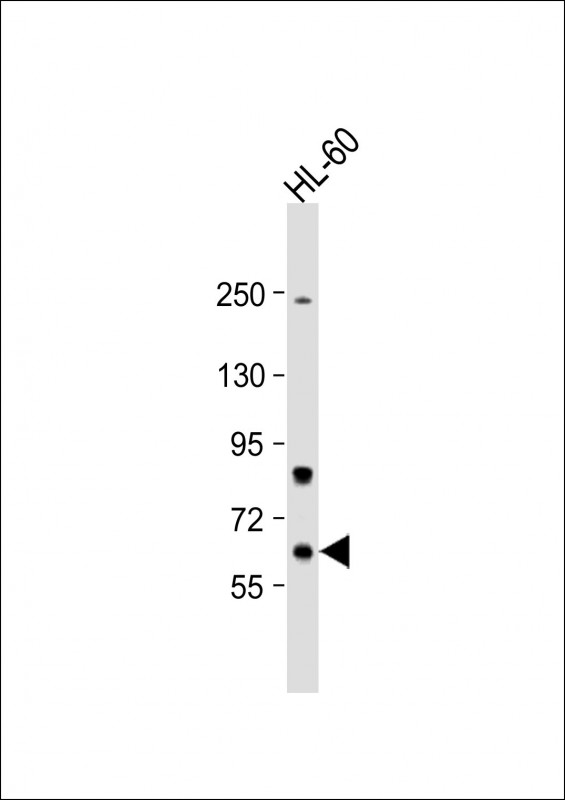 Anti-MARS2 Antibody (C-term) at 1:1000 dilution + HL-60 whole cell lysate Lysates/proteins at 20 μg per lane. Secondary Goat Anti-Rabbit IgG, (H+L), Peroxidase conjugated at 1/10000 dilution. Predicted band size : 67 kDa Blocking/Dilution buffer: 5% NFDM/TBST.
