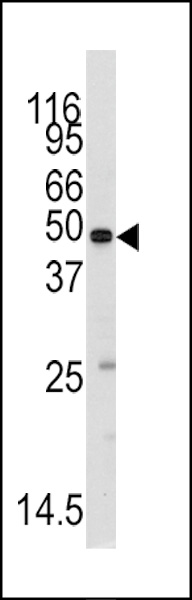 Western blot analysis of anti-MARS2 Antibody (C-term) (APR17354G) in mouse testis tissue lysates (35ug/lane). MARS2(arrow) was detected using the purified Pab.