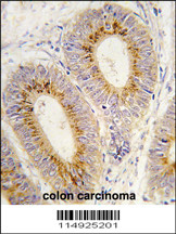 Formalin-fixed and paraffin-embedded human colon carcinoma tissue reacted with MARS2 antibody (C-term) (Cat. APR17354G), which was peroxidase-conjugated to the secondary antibody, followed by DAB staining. This data demonstrates the use of this antibody for immunohistochemistry; clinical relevance has not been evaluated. |