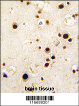 Formalin-fixed and paraffin-embedded human brain tissue reacted with HNRPQ antibody (C-term), which was peroxidase-conjugated to the secondary antibody, followed by DAB staining. This data demonstrates the use of this antibody for immunohistochemistry; clinical relevance has not been evaluated. |
