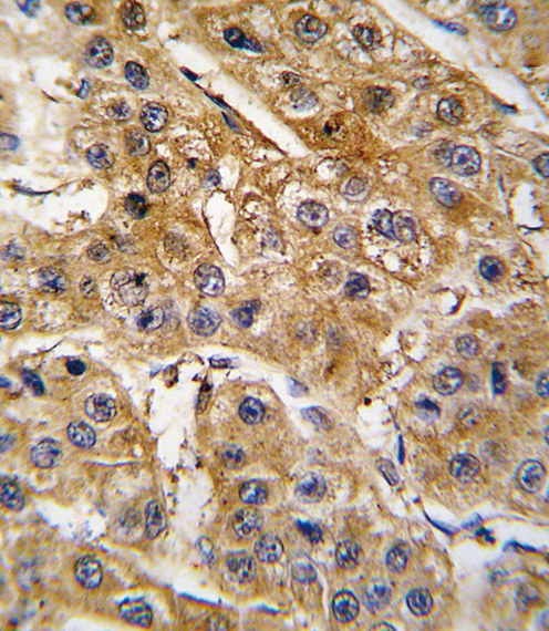 Formalin-fixed and paraffin-embedded human hepatocarcinoma tissue reacted with AGT antibody (N-term), which was peroxidase-conjugated to the secondary antibody, followed by DAB staining. This data demonstrates the use of this antibody for immunohistochemistry; clinical relevance has not been evaluated. |