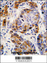 Formalin-fixed and paraffin-embedded human hepatocarcinoma tissue reacted with ALDH4A1 antibody (Center), which was peroxidase-conjugated to the secondary antibody, followed by DAB staining. This data demonstrates the use of this antibody for immunohistochemistry; clinical relevance has not been evaluated.