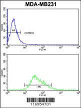 CYP21A2 Antibody (Center) (Cat. APR07096G) flow cytometric analysis of MDA-MB231 cells (bottom histogram) compared to a negative control cell (top histogram).FITC-conjugated goat-anti-rabbit secondary antibodies were used for the analysis. |