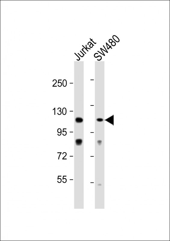 All lanes : Anti-MLK1 Antibody (C-term) at 1:1000 dilution Lane 1: Jurkat whole cell lysate Lane 2: SW480 whole cell lysate Lysates/proteins at 20 μg per lane. Secondary Goat Anti-Rabbit IgG, (H+L), Peroxidase conjugated at 1/10000 dilution. Predicted band size : 122 kDa Blocking/Dilution buffer: 5% NFDM/TBST.