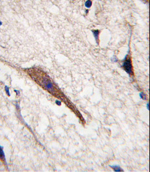 Formalin-fixed and paraffin-embedded human brain tissue reacted with PAK5 antibody, which was peroxidase-conjugated to the secondary antibody, followed by DAB staining. This data demonstrates the use of this antibody for immunohistochemistry; clinical relevance has not been evaluated. |