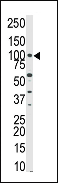 Western blot analysis of anti-PKN-beta Pab (Cat. AMM07213G) in HeLa cell lysate. PKNbeta (arrow) was detected using purified Pab. Secondary HRP-anti-rabbit was used for signal visualization with chemiluminescence.