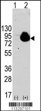 Western blot analysis of RPS6KA1 (arrow) using rabbit polyclonal RPS6KA1 Antibody (S732). 293 cell lysates (2 ug/lane) either nontransfected (Lane 1) or transiently transfected with the RPS6KA1 gene (Lane 2) (Origene Technologies).