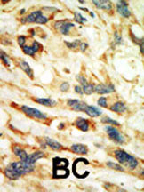 Formalin-fixed and paraffin-embedded human cancer tissue reacted with the primary antibody, which was peroxidase-conjugated to the secondary antibody, followed by AEC staining. This data demonstrates the use of this antibody for immunohistochemistry; clinical relevance has not been evaluated. BC = breast carcinoma; HC = hepatocarcinoma. |