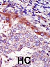 Formalin-fixed and paraffin-embedded human cancer tissue reacted with the primary antibody, which was peroxidase-conjugated to the secondary antibody, followed by AEC staining. This data demonstrates the use of this antibody for immunohistochemistry; clinical relevance has not been evaluated. BC = breast carcinoma; HC = hepatocarcinoma. |